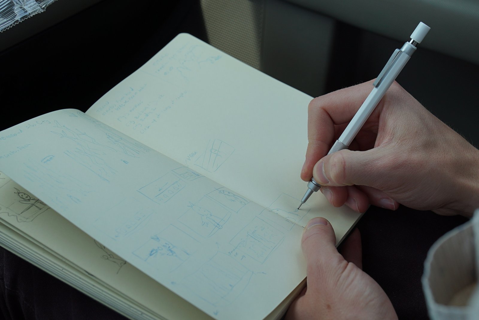 The drive went pretty fast. Mike sketched as we storyboarded tonight's episode, and worked on some animations along the way.